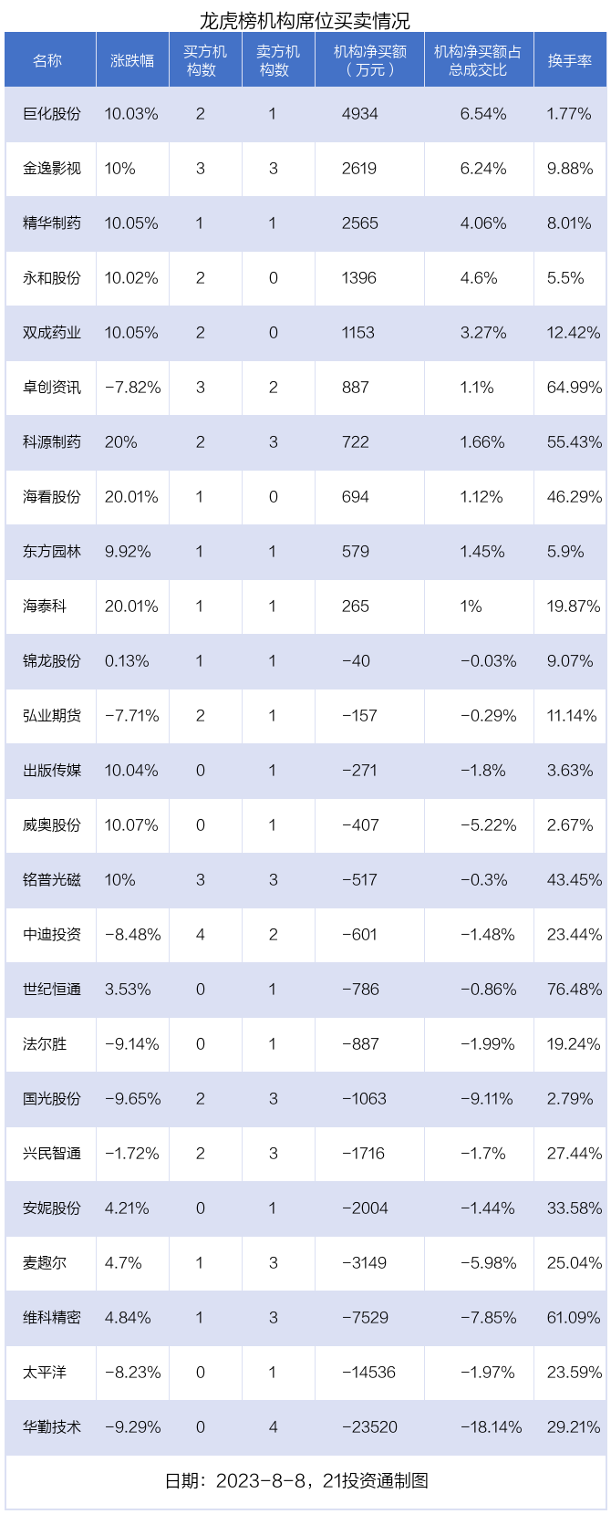 8月8日,25只個股龍虎榜出現了機構的身影,機構合計凈賣出4.14億元。具體來看,機構凈買入10股,凈賣出15股。