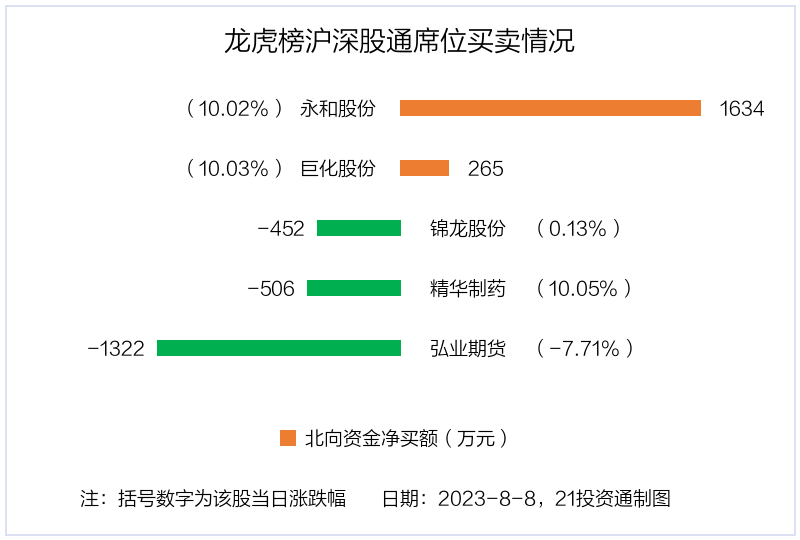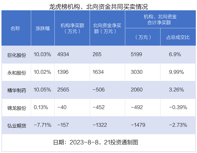值得注意的是,機構和北向資金共同凈買入了永和股份、巨化股份等2股;共同凈賣出了錦龍股份、弘業期貨等2股;在精華制藥上出現分歧,機構凈買入精華制藥2565.1萬元,北向資金凈賣出505.52萬元。