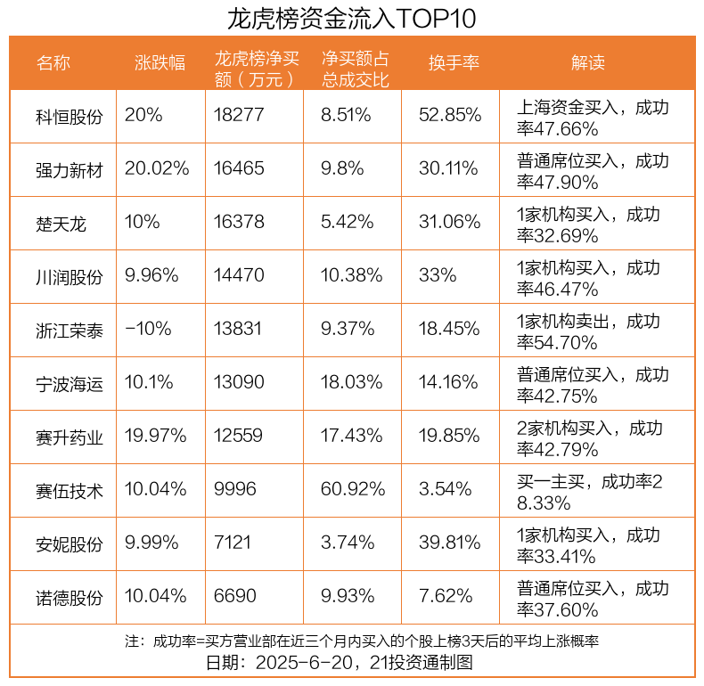 6月20日,上證指數(shù)下跌0.07%,深證成指下跌0.47%,創(chuàng)業(yè)板指下跌0.84%。盤后龍虎榜數(shù)據(jù)顯示,共有57只個股因當(dāng)日異動登上龍虎榜,資金凈流入最多的是科恒股份(300340.SZ),達1.83億元。