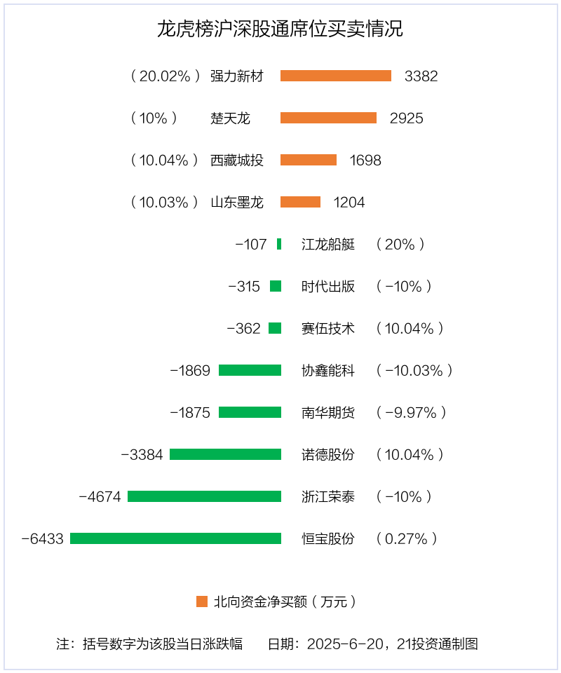 6月20日,北向資金參與龍虎榜中的個股共有12只,合計凈賣出9807.92萬元。其中滬股通凈買入1 股,凈賣出5 股,合計凈賣出8911.17萬元;深股通凈買入3 股,凈賣出3 股,合計凈賣出896.75萬元。