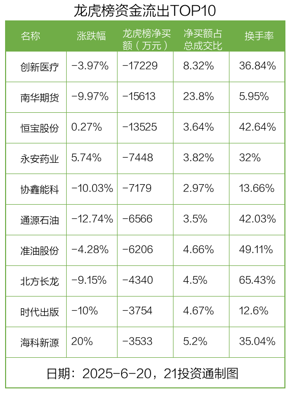 而龍虎榜中資金凈流出最多的是創(chuàng)新醫(yī)療(002173.SZ),被凈賣出為1.72億元,占總成交金額的8.32%。創(chuàng)新醫(yī)療收盤下跌3.97%,換手率為36.84%。