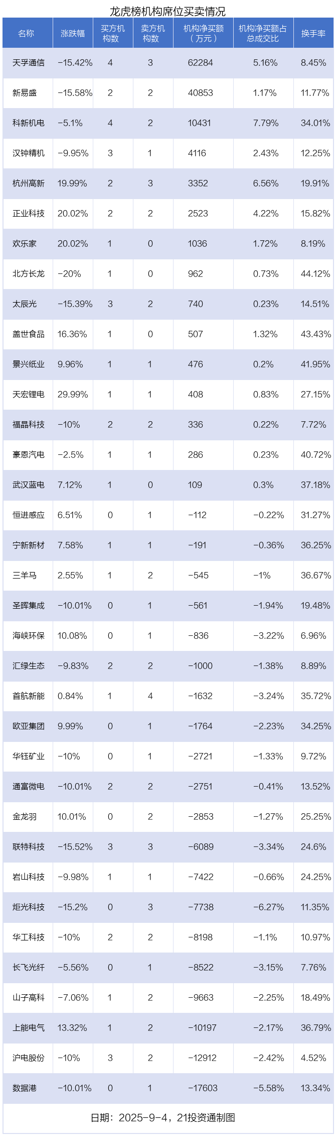 其中,機構凈買入金額最多的是天孚通信(300394.SZ),當日收盤下跌15.42%,換手率為8.45%。