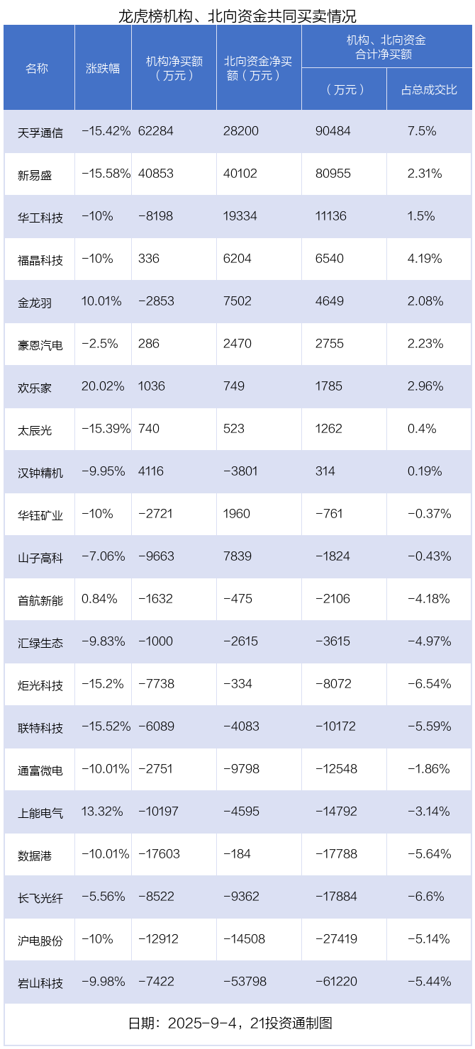 值得注意的是,機構和北向資金共同凈買入了新易盛、天孚通信、福晶科技、豪恩汽電、歡樂家、太辰光等6股;共同凈賣出了數據港、炬光科技、首航新能、匯綠生態、聯特科技、上能電氣、長飛光纖、通富微電、滬電股份、巖山科技等10股;在華工科技,山子高科,金龍羽,華鈺礦業,漢鐘精機上出現分歧,機構凈賣出華工科技8197.71萬元,北向資金凈買入1.93億元;機構凈賣出山子高科9662.61萬元,北向資金凈買入7838.79萬元;機構凈賣出金龍羽2852.99萬元,北向資金凈買入7502.04萬元;機構凈賣出華鈺礦業2721.16萬元,北向資金凈買入1960.4萬元;機構凈買入漢鐘精機4115.51萬元,北向資金凈賣出3801.46萬元。