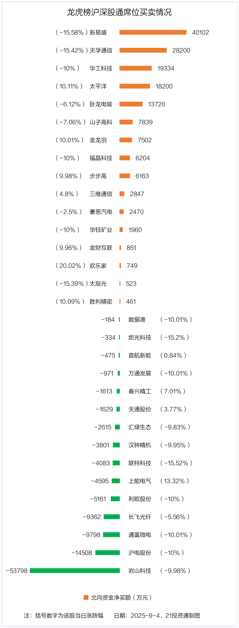 北向資金凈買入金額最多的是新易盛(300502.SZ),凈買入4.01億元,占總成交金額的1.15%。凈賣出金額最多的是巖山科技(002195.SZ),為5.38億元,占總成交金額的4.78%,當日收盤下跌9.98%,換手率為24.25%。