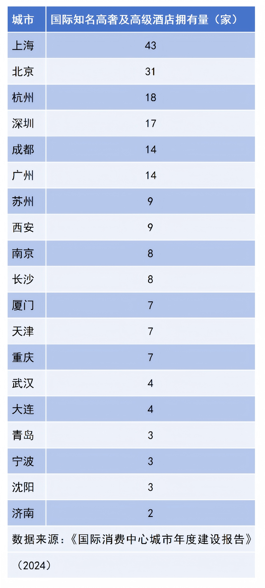 2024年,21世紀經濟研究院與仲量聯行聯合發布的《國際消費中心城市年度建設報告》中,也將高等級酒店的數量納入評價范圍,認為這是衡量一座城市在“國際吸引力”上的重要指標。