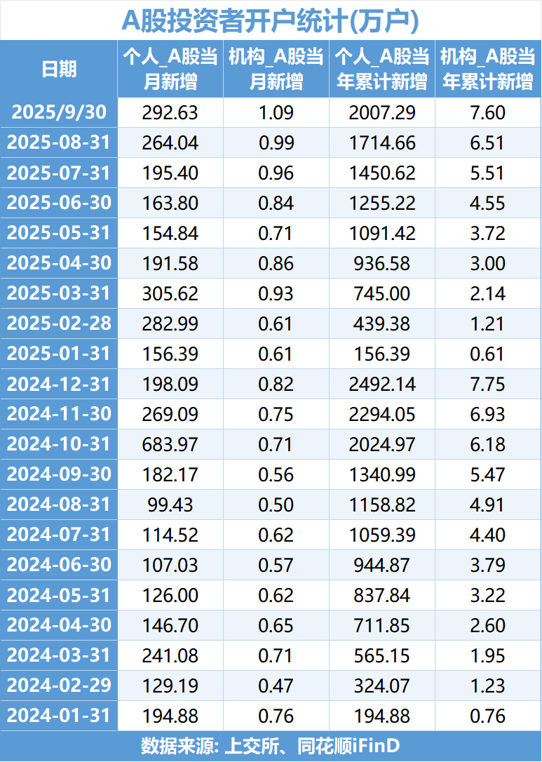 具體來看,9月A股293.72萬戶中,個人新開戶292.63萬戶,機構新開戶1.09萬戶,這屬于今年以來機構新開戶首次突破1萬戶。