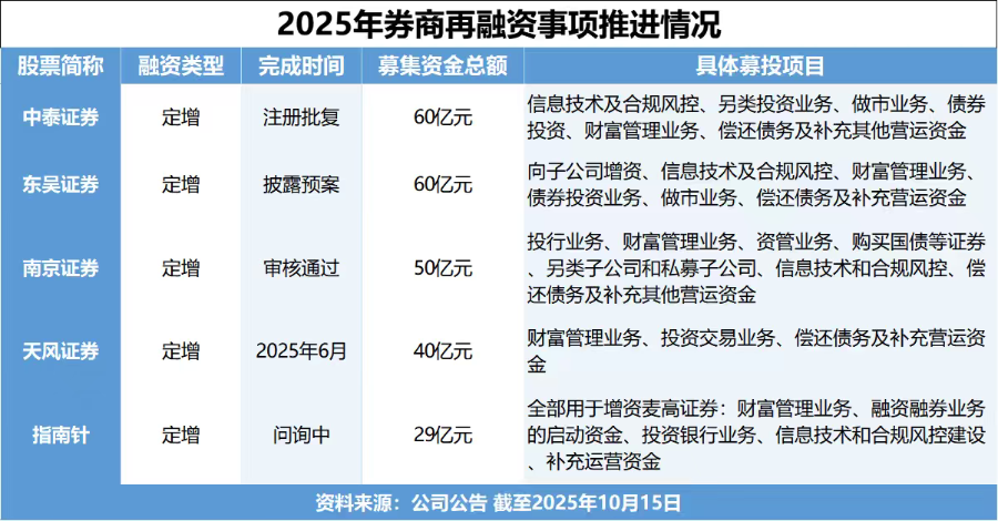 2025年以來,多家券商密集推進定增計劃,形成明顯的“補血”潮。其中,指南針(300803.SZ)5月更新29億元定增方案修訂稿;天風證券(601162.SH)6月23日完成40億元定增募資;東吳證券(601555.SH)7月10日公布60億元定增預案,成為年內首家公布定增計劃的券商;南京證券(601990.SH)50億元定增也于9月29日獲上交所審核通過。