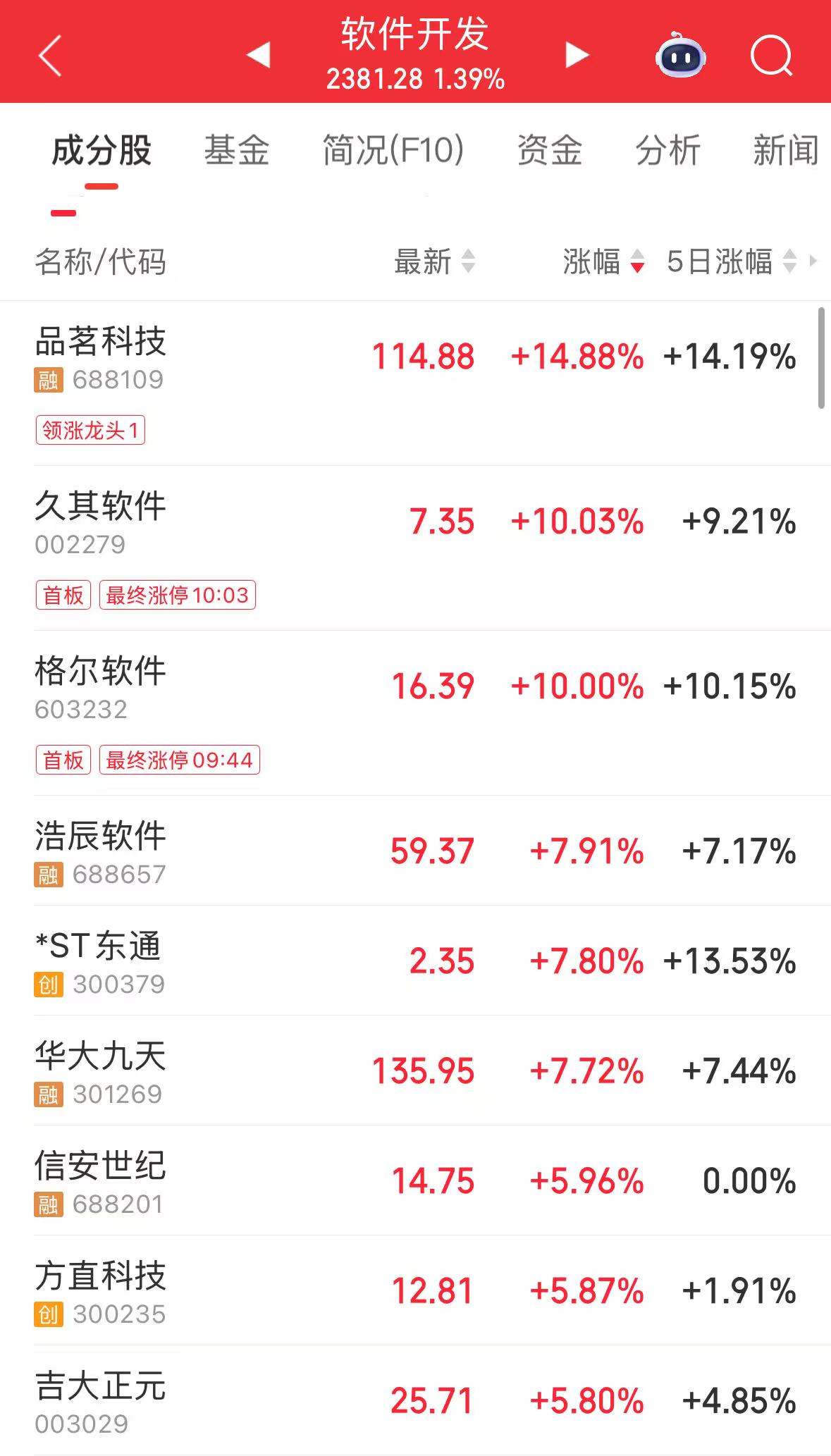 10月15日,國產軟件概念震蕩拉升,久其軟件、格爾軟件雙雙漲停,品茗科技漲超10%,浩辰軟件、華大九天、信安世紀等多股跟漲。