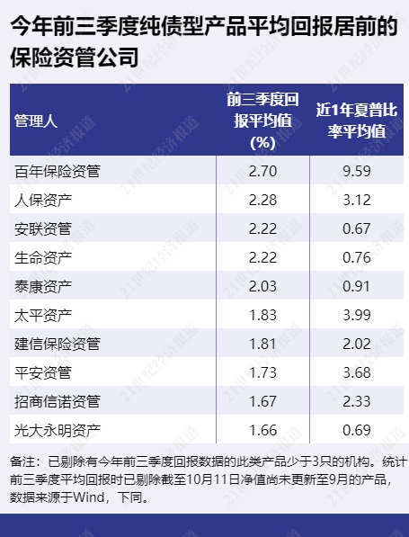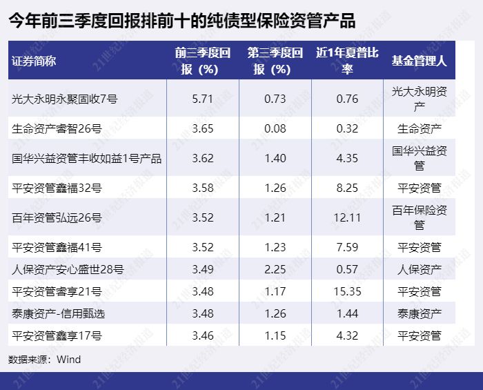 前三季度回報靠前的純債型保險資管產品包括“光大永明永聚固收7號”“生命資產睿智26號”和“國華興益資管豐收如益1號產品”等。此類產品前三季度平均回報排名居前的保險資管公司有百年保險資管、人保資產、安聯資管等。排名靠后的保險資管公司有中意資產、工銀安盛資管、國華興益資管等。