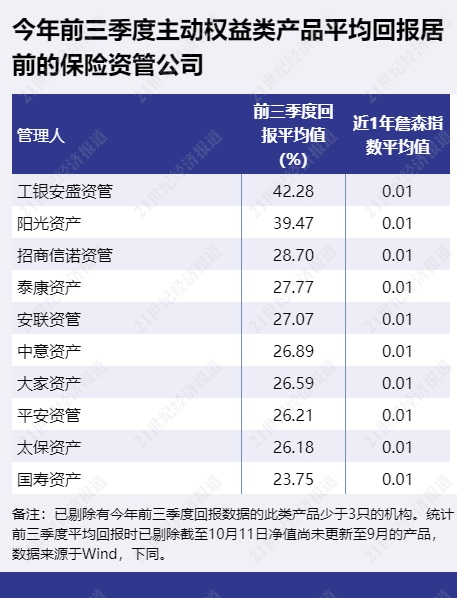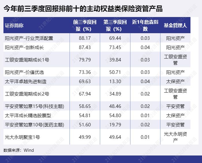 3、主動權益類:部分保險資管產品前三季度回報超80%