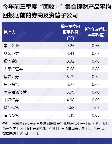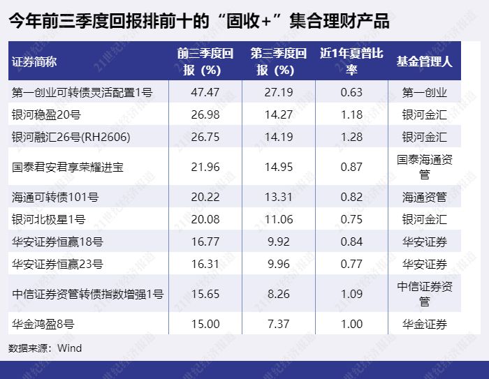 “固收+”集合理財產品通過“+”的部分投資分享權益類資產等其他類型資產上漲的收益,收益表現頗為亮眼。已有6只產品前三季度收益率超過20%。