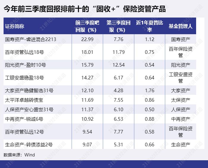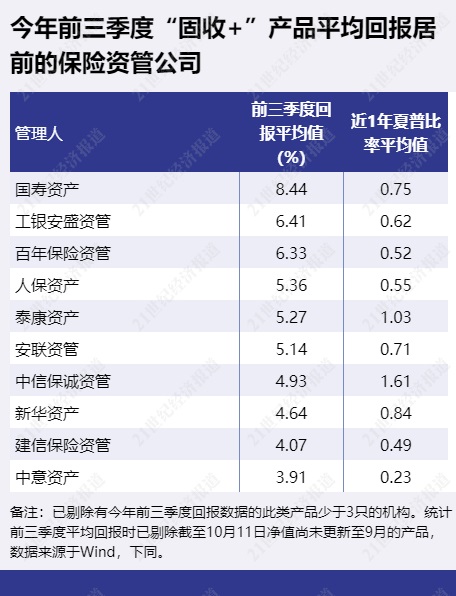 前三季度“固收+”產品平均回報排名靠后的保險資管公司則包括民生通惠、合眾資產、華安資產等。