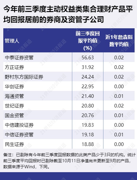 3、主動權益類產品:萬聯資管、大同證券等前三季度和9月平均回報排名靠后