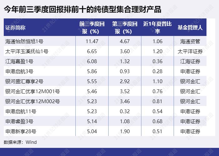 1、純債型產品表現:3只純債型集合理財產品前三季度回報超6%