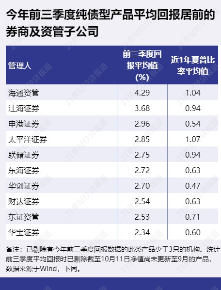 1、純債型產品:中泰證券資管前三季度和9月平均回報排名靠后