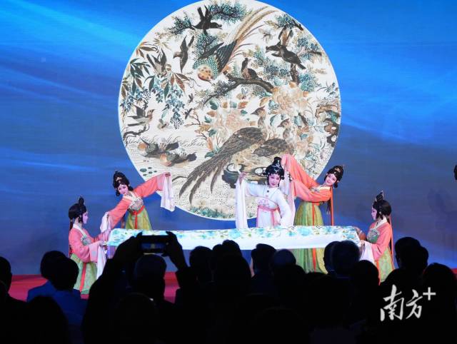 醒獅靈動起舞,英歌鏗鏘騰躍,在兩大嶺南非遺亮相迎賓之后,開幕式正式啟幕。廣州粵劇院帶來大型新編古裝粵劇《雙繡緣》選段,贏得現場陣陣掌聲。