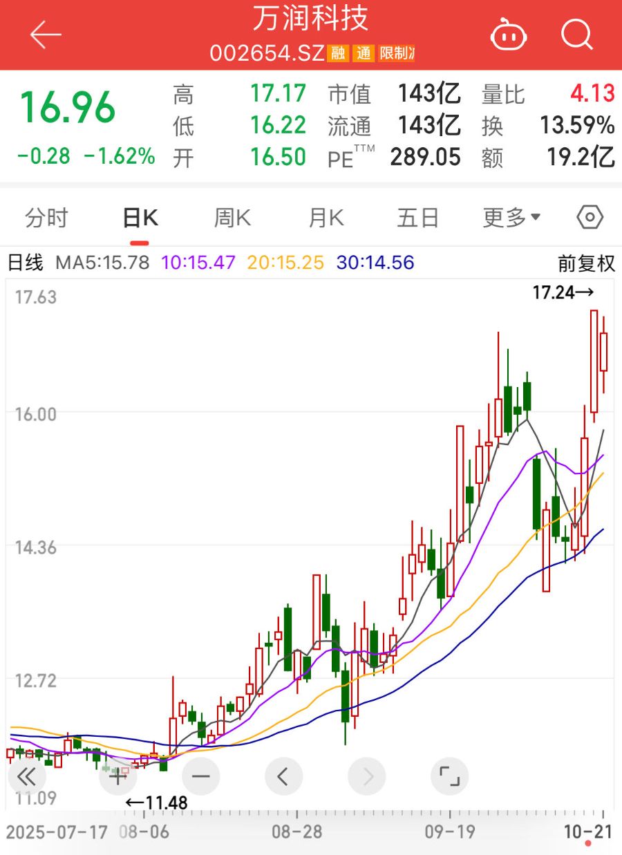 10月21日,萬潤科技(002654.SZ)低開震蕩,截至9時(shí)58分報(bào)16.85元/股,跌幅2.26%。此前兩個(gè)交易日(10月17日、20日),其股價(jià)累計(jì)漲幅超17%,其中20日更是強(qiáng)勢漲停。
