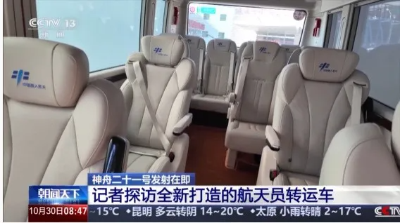 充分體現了航天員出征的儀式感和榮譽感。每一個座椅的頭枕上都增加了 “中國載人航天” 的標識,車門踏板上有同樣標識的氛圍燈。