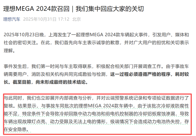 調查結果顯示,與事故車同批次的2024款理想MEGA車輛中,冷卻液防腐性能不足,特定條件下會導致冷卻回路中動力電池和前電機控制器的冷卻鋁板腐蝕滲漏,導致車輛出現故障燈點亮、動力受限及無法上電的情形,極端情況下會造成動力電池熱失控,存在安全隱患。