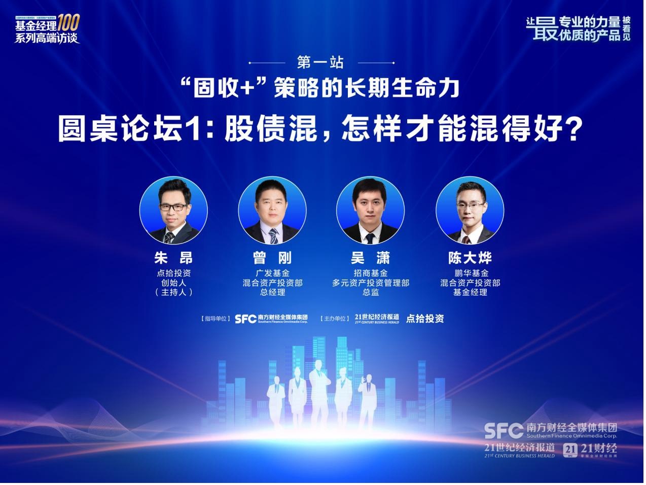 在“股債混,怎樣才能混得好?”為主題的首場圓桌討論中,由點拾投資創始人朱昂擔任主持人,廣發基金混合資產投資部總經理曾剛、招商基金多元資產投資管理部總監吳瀟、鵬華基金混合資產投資部基金經理陳大燁三位風格鮮明、經驗豐富的基金經理,圍繞如何優化風險收益比、追求實現絕對收益目標、應對市場變化以及與量化結合等關鍵問題,展開了坦誠而富有洞見的分享。