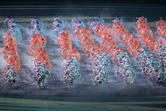 總制作人王銳祥分享了這一設計背后的巧思——“水舞臺”的設計踐行了本次開幕式“簡約”的核心理念,用創意而非人海戰術來營造飽滿的舞臺效果。他解釋道:“體育場空間宏大,容易顯得空曠。環形舞臺的視覺引導,能將觀眾視線從超過2萬平方米的場地,聚焦至5000平方米的核心表演區。僅3000多名演員在廣闊的體育場里,也可以演出千軍萬馬的聲勢?!毙Ч胺Q“四兩撥千斤”。