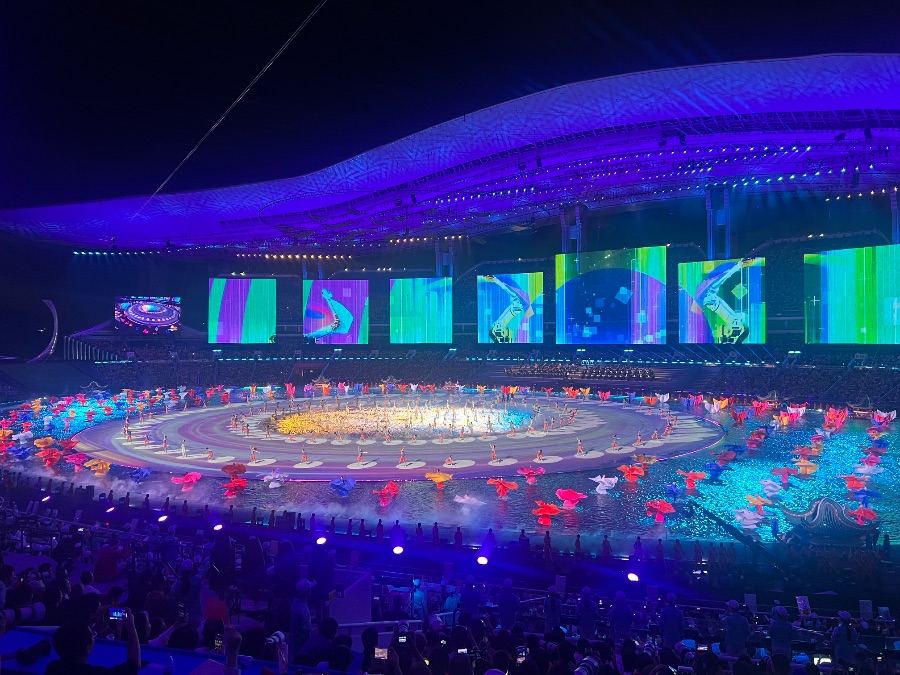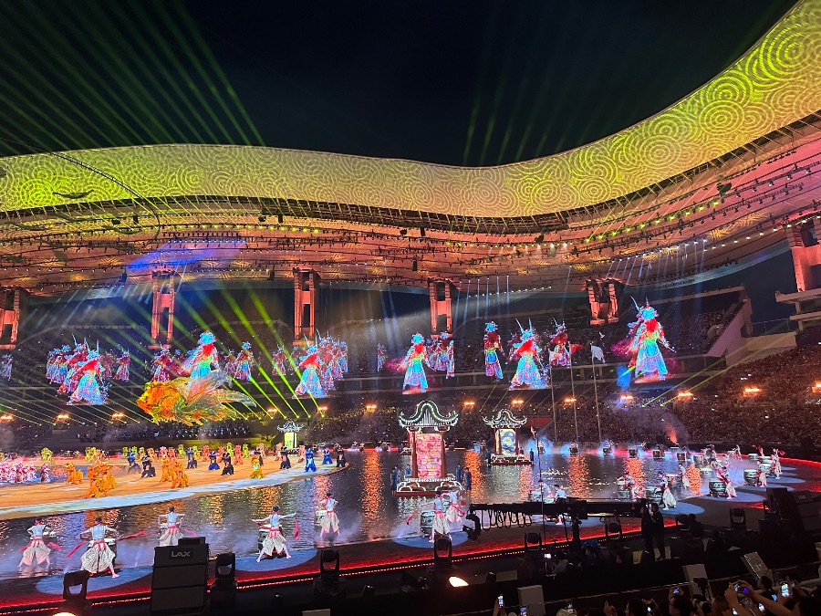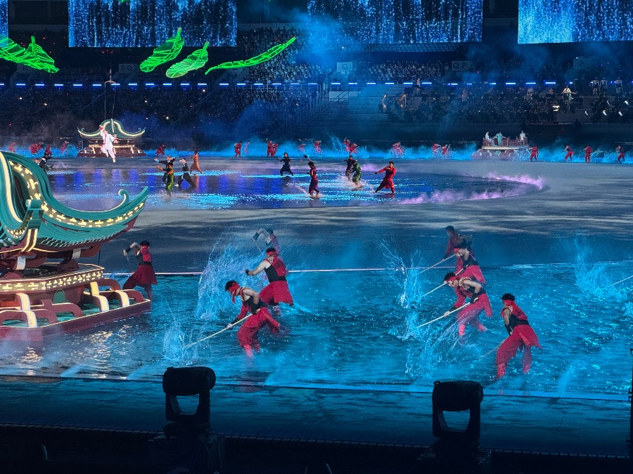 粵港澳大灣區的城市均臨海靠水、因水而興。本次開幕式表演以水作為核心表達,水的元素以不同形式呈現貫穿全場,并在體育場內打造了水舞臺。