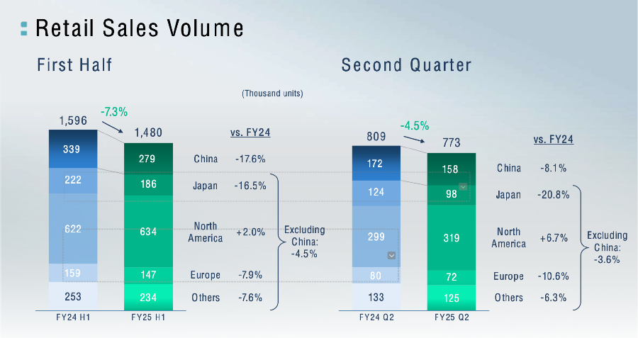 2025財年上半年(4月至9月),日產(chǎn)全球銷量同比下跌7.27%至148萬輛,中國、日本兩大核心市場銷量跌幅分別高達17.6%和16.5%。