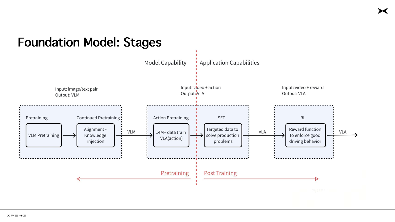 在演示中,他將小鵬物理世界基座模型分了三個階段(Foundation Model Stages):