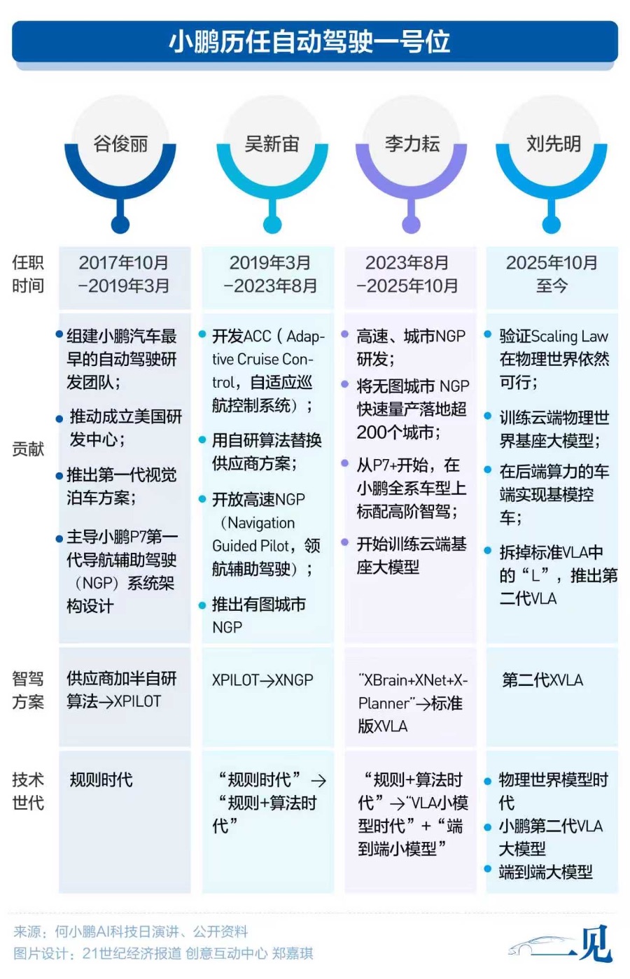 新帥接棒并非另起爐灶,而是薪火相傳。吳新宙的開疆拓土,和李力耘的量產(chǎn)落地,才讓如今劉先明得以推動小鵬自動駕駛向物理AI時代跨越。