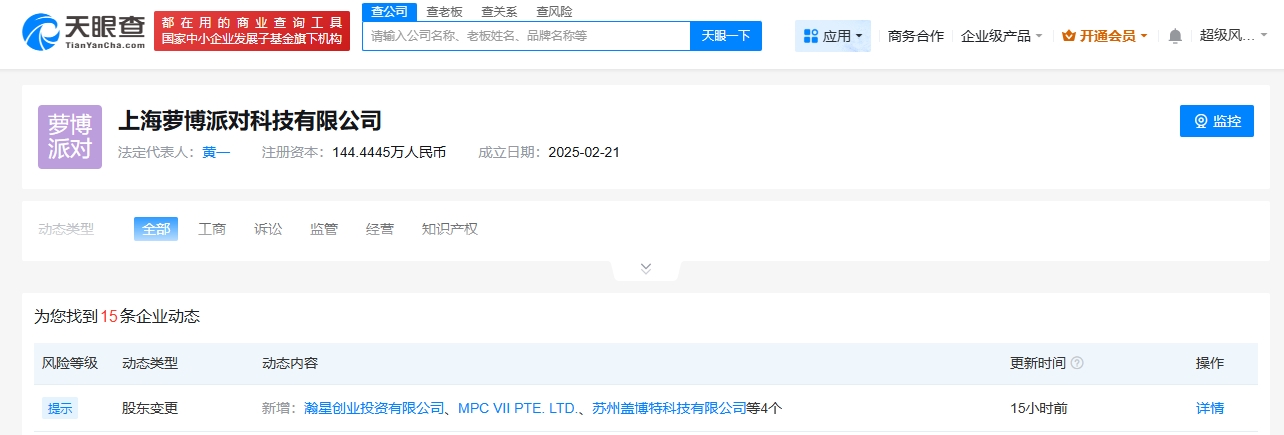 11月12日,天眼查工商信息顯示,近日,上海蘿博派對科技有限公司發生工商變更,新增小米旗下瀚星創業投資有限公司等為股東,注冊資本也由約107萬人民幣增至144萬人民幣。