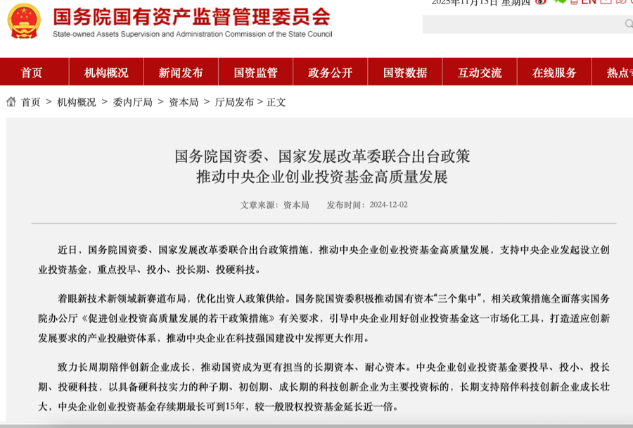 上述央企創投基金成立的政策背景是,國資委提出,到2025年央企在戰新產業收入占比要達到35%。2024年12月,國務院國資委、國家發展改革委聯合出臺政策措施,推動中央企業創業投資基金高質量發展,支持中央企業發起設立創業投資基金,重點投早、投小、投長期、投硬科技。