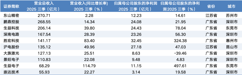 從板塊統計來看,在2025年第三季度總營收規模前10的企業中,廣東企業擁有8家,包括鵬鼎控股(268.55億元)、生益科技(206.14億元)、深南電路(167.54億元)等巨頭。更令人矚目的是增長質量上的優勢。在營收增速方面,生益電子以114.79%的增幅領跑全行業,勝宏科技以83.40%緊隨其后;在關鍵指標歸母凈利潤增速上,生益電子與勝宏科技以幾百倍的增長率表現矚目。這種規模與利潤的雙重領先,充分證明了廣東PCB產業在技術創新、市場響應和成本控制上的全方位優勢。