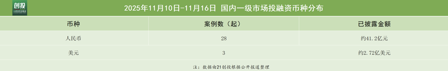 21創投不完全統計11月10日—11月16日,報告日期內國內一級市場發生融資事件41起。其中,有31筆融資披露了融資金額和幣種信息,總規模約合人民幣60.5億元人民幣。