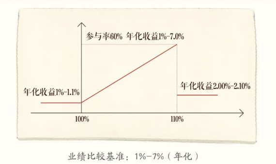 2)若觀察期內掛鉤標的定盤價格均低于障礙價格(即期初價格的110%),且期末價格高于或等于行權價格(即期初價格的100%),則產品的業績比較基準為1%~7%(年化);