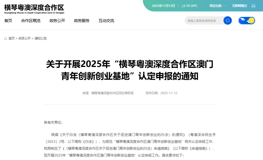 11月12日,合作區民生事務局發布關于開展2025年“橫琴粵澳深度合作區澳門青年創新創業基地”認定申報的通知。本次認定申報工作根據《橫琴粵澳深度合作區關于促進澳門青年創新創業的辦法》及《橫琴粵澳深度合作區關于促進澳門青年創新創業的辦法》申報指南進行。