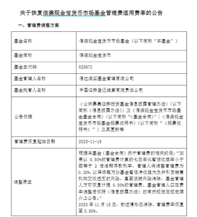 11月20日,信澳現金寶與富安達神州天添利兩只貨幣基金,雙雙發布了恢復基金管理費適用費率的公告,宣布自11月18日起將基金管理費分別恢復至0.80%和0.55%。
