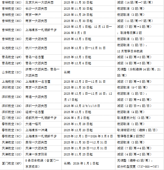 從12月1日起中國航司原定的中日航班未來數月將面臨較大規模的減班和取消,時間跨度覆蓋元旦和春節,直至2026年3月底。