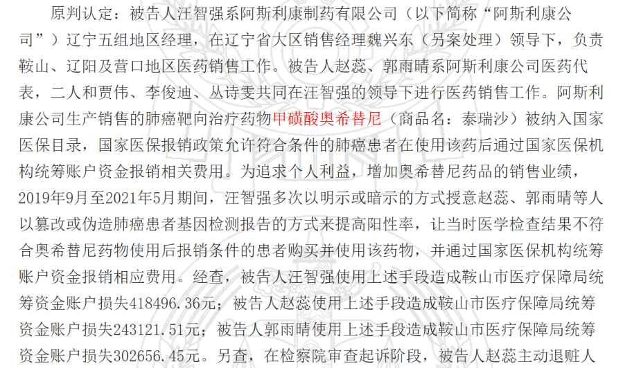 2025年6月28日公開的一份二審刑事判決書顯示,為追求個人利益,增加奧希替尼(商品名:泰瑞沙)藥品的銷售業績,2019年9月至2021年5月期間,阿斯利康遼寧五組地區經理汪某,多次以明示或暗示的方式授意公司醫藥代表趙某、郭某等人以篡改或偽造肺癌患者基因檢測報告的方式來提高陽性率,讓當時醫學檢查結果不符合奧希替尼藥物使用后報銷條件的患者購買并使用該藥物,并通過國家醫保機構統籌賬戶資金報銷相應費用。