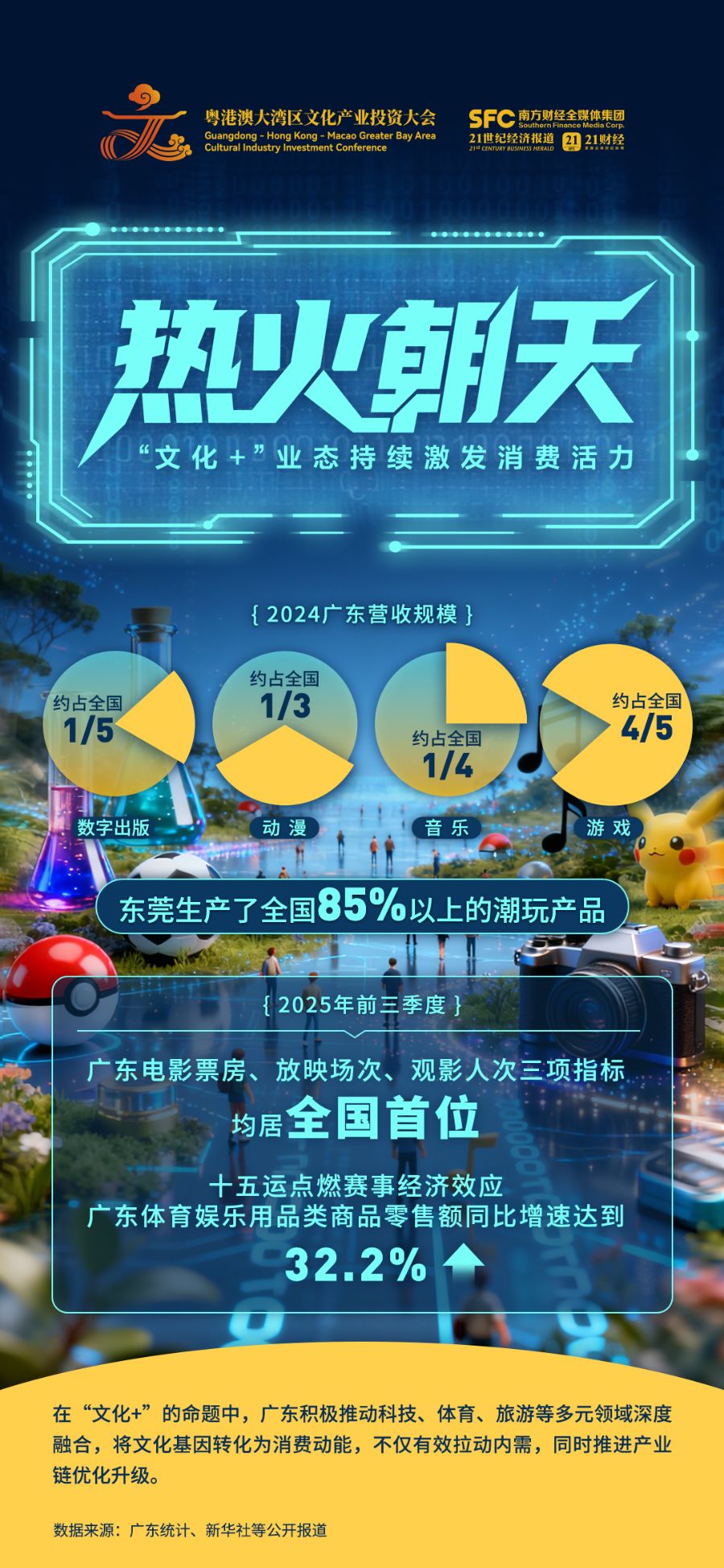 近年來,《黑神話:悟空》《哪吒之魔童鬧海》等持續火爆出圈,并且產生裂變效應、長尾效應,充分展現了文化產業的發展潛力。作為中國文化產業第一大省,廣東依托深厚的歷史文化底蘊、活躍的市場環境和完善的產業體系,搶先布局,開辟更多文化新業態、新賽道,文化產業規模總量連續22年居全國首位,在數字創意、動漫游戲、網絡視聽、數字文化制造等領域已建立起顯著競爭優勢。