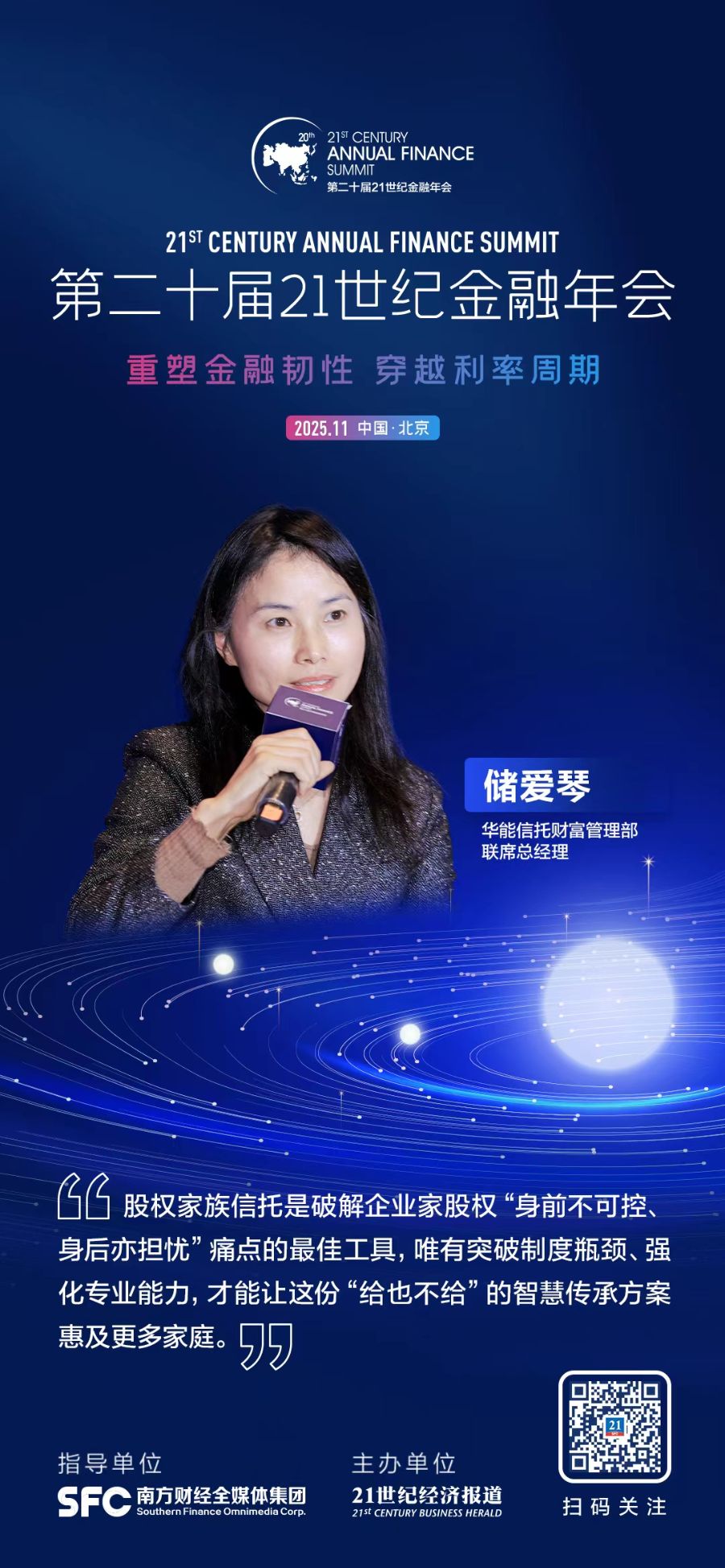 21世紀經濟報道記者 葉麥穗 近日,在“第二十屆21世紀金融年會”之“財富管理的低利率之問”主題論壇上,華能信托財富管理部聯席總經理儲愛琴圍繞低息環境下的財富管理新路徑展開深度分享,結合行業實踐解析保險信托、股權家族信托等核心業務的發展現狀與未來機遇,為行業發展提供了極具價值的思考。