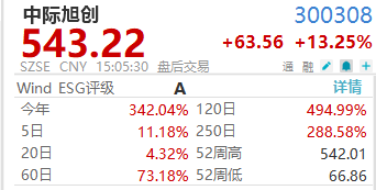 其中,中際旭創漲超13%,再創歷史新高,總市值突破6000億元。該股近120個交易日已漲近500%,年內漲幅達342%。