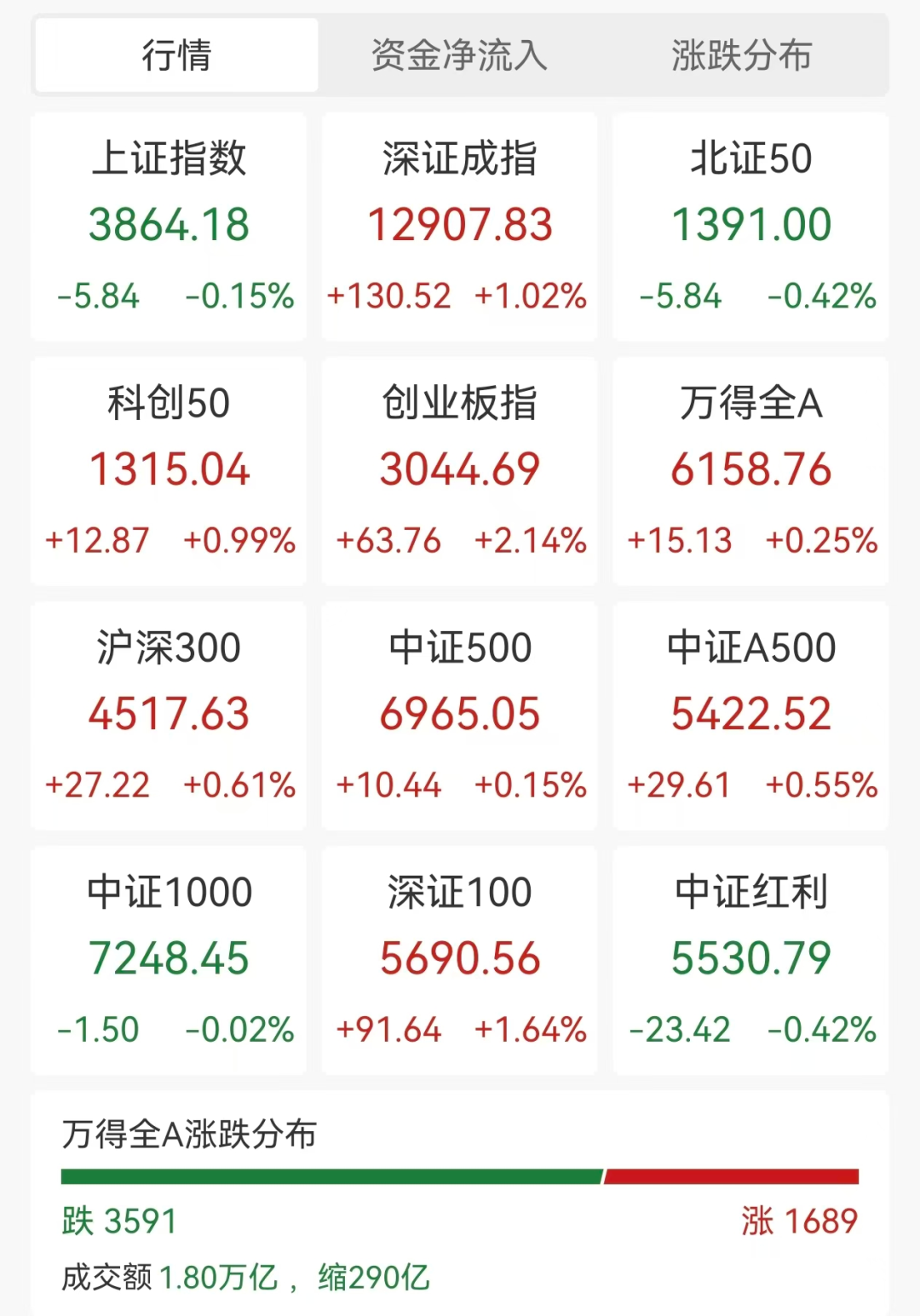 11月26日,深成指、創業板指低開高走,創業板指盤中一度漲超3%,收盤漲2.14%。滬深兩市成交額1.78萬億,較上一個交易日縮量288億。全市場1689股上漲,超3500股下跌。