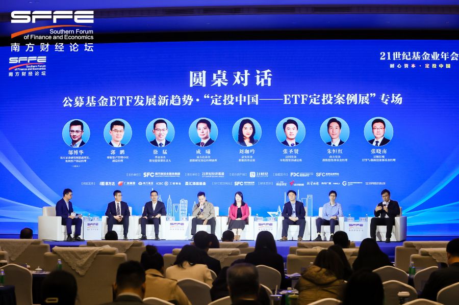 大會上,一場聚焦公募基金ETF發展新趨勢的圓桌對話也同步開啟。在由深交所和21世紀經濟報道聯合舉辦的“定投中國—ETF定投案例展”專場圓桌對話環節,7位來自頭部公募、深耕指數與產品領域的優秀代表,共同探討了ETF的責任、創新、生態與未來。