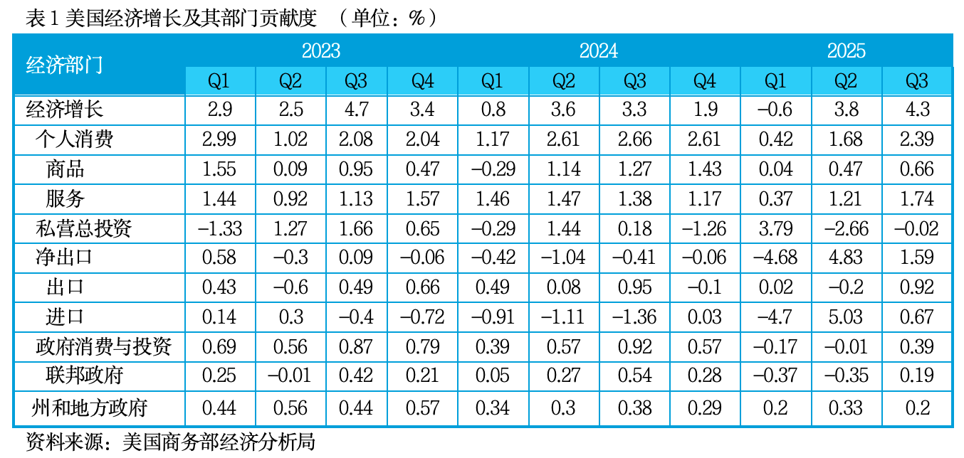中新社報道,美國商務部的首次預估數據顯示,今年第三季度美國實際國內生產總值(GDP)環比按年率計算增長4.3%,高于市場普遍預期。數據顯示,2025年三季度美國經濟環比增長4.3%,高于二季度的3.8%,創兩年來季度環比最快增速。具體來看,與第二季度相比,第三季度跟人消費增長達第三季度個人消費增長達2.39%,商品和服務消費消費兩旺。其中,非耐用品增長較快,汽車消費比較強勁。私營部門總投資增長復蘇較快,由第二季度的-2.66%跳升至-0.02%。信息處理設備和研發投入較大,但其它行業投資力度較弱。AI投資從開年以來呈高開低走之勢,今年前第一季度、第二季度和第三季度的信息處理設備歸美國經濟增長的貢獻率分別為0.88%、0.22%、0.16%。