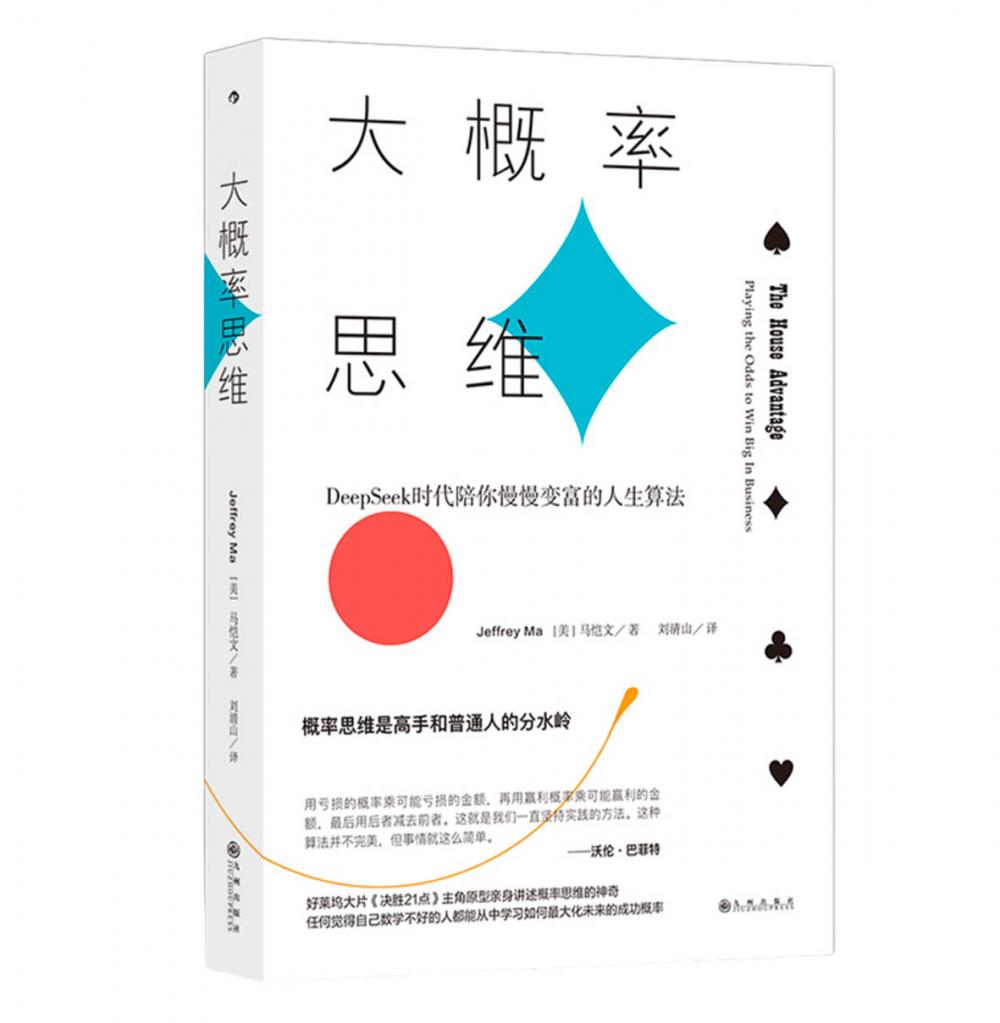 其實這主要是告訴你概率思維的作用。由馬愷文(Jeffrey Ma)所寫的《大概率思維》(The House Advantage)這本書主要就是講述概率思維的神奇,以及人在概率思維之下應如何在非確定性環境下建立理性決策范式。中譯本由九州出版社出版,封面設計頗為新穎,幾個撲克牌的logo一出現的場景,顯示要講述的內容必然是與“算法”相關了。馬愷文是麻省理工大學計量分析的高材生,他將自己的數牌體系廣泛應用于投資理財、商業決策、人生規劃等領域,均收獲頗豐。