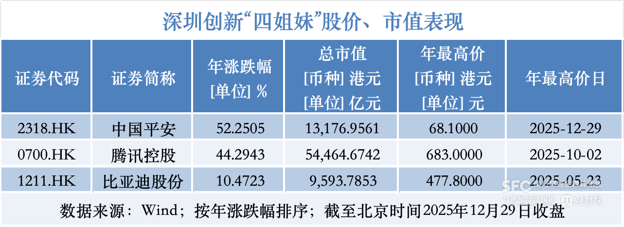再看“深圳四姐妹”具體表現:除華為未上市外,其他三家公司港股年內全部錄得上漲,中國平安與騰訊年漲幅均跑贏恒生指數與滬深300。其中,中國平安(2318.HK)截至12月29日收盤年漲幅52.25%,位居“四姐妹”之首;騰訊(0700.HK)年漲幅44.29%緊隨其后;比亞迪(1211.HK)年漲幅10.47%。