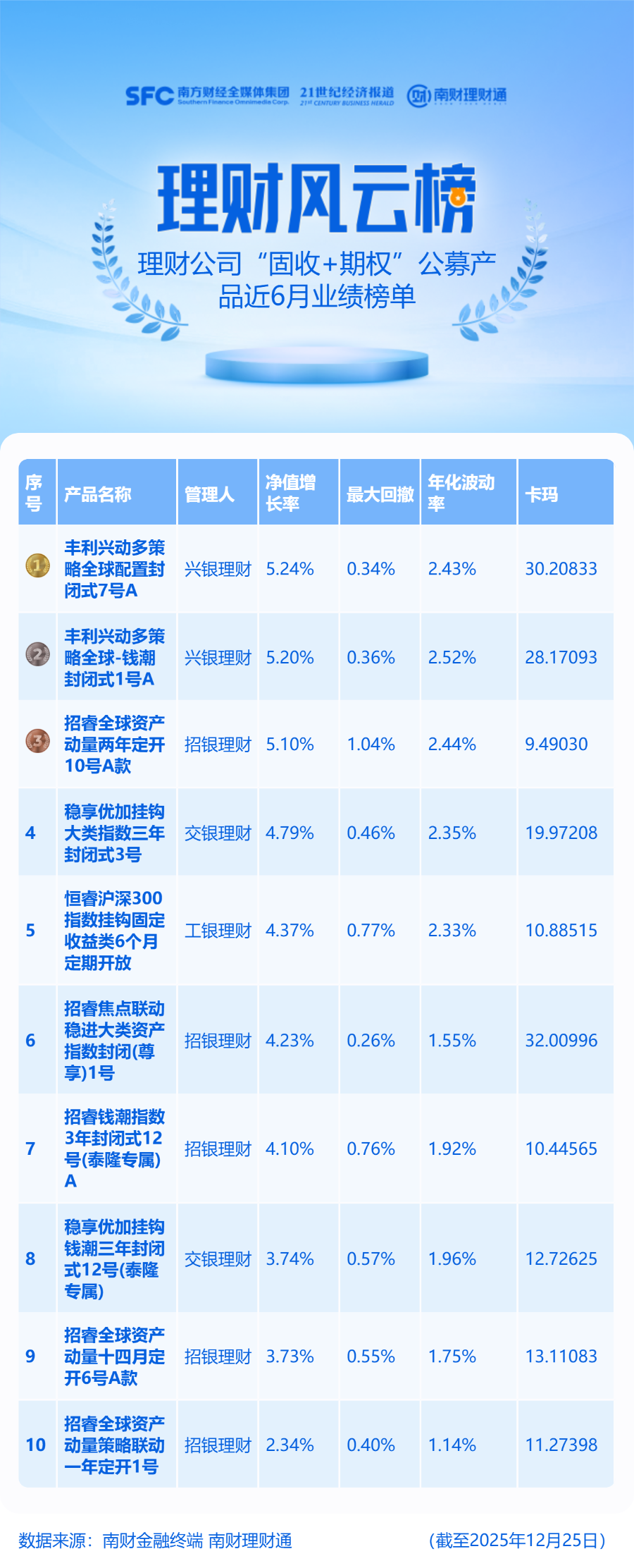 產品統計范圍為理財公司發行的公募“固收+期權”理財產品,統計截止日期為2025年12月25日,統計區間為近6月。